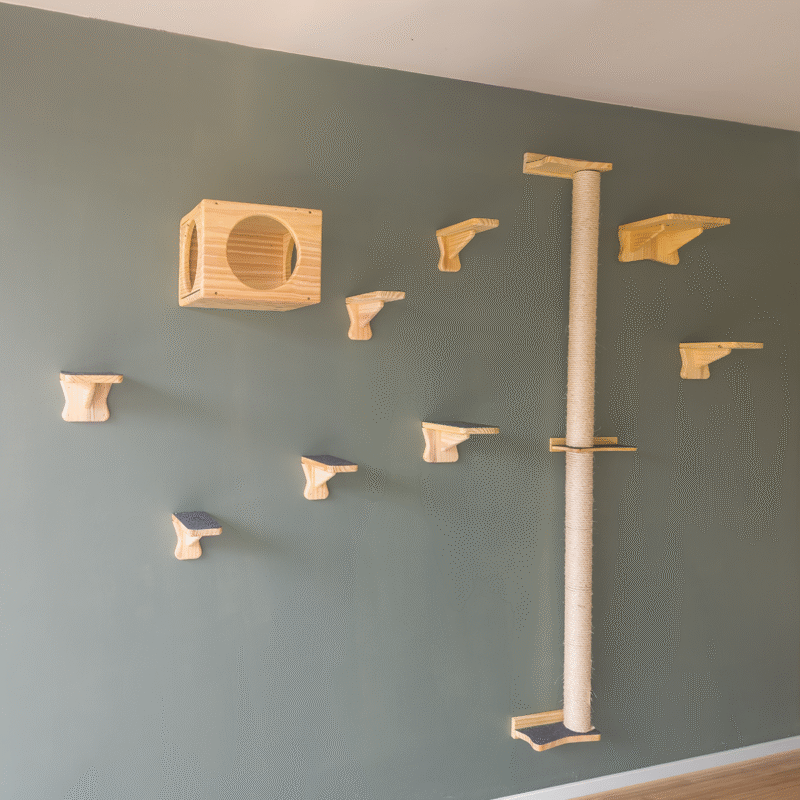 Cada detalhe desse kit foi pensado com carinho: do design minimalista que harmoniza com seu lar, aos materiais naturais como o pinus reflorestado e o sisal, que trazem segurança e conforto para o seu gato se divertir sem preocupações. As bases firmes garantem estabilidade, enquanto o acabamento elegante reflete a dedicação em criar um ambiente acolhedor.